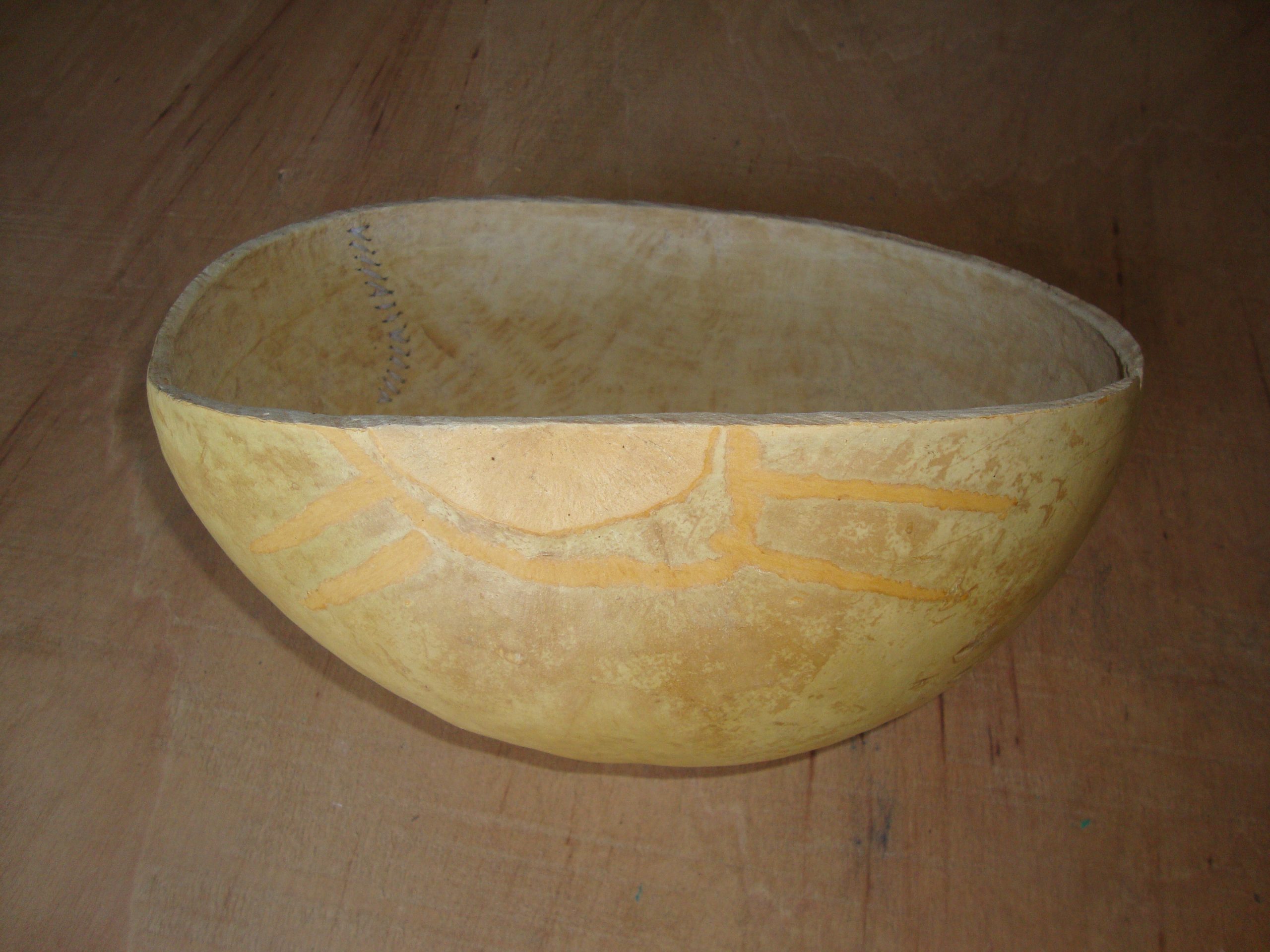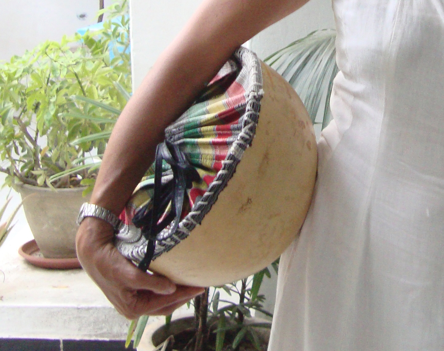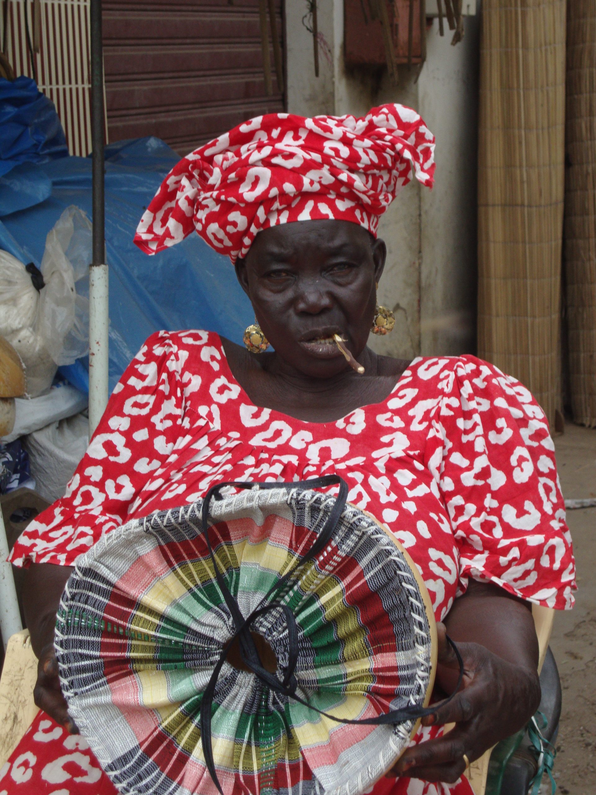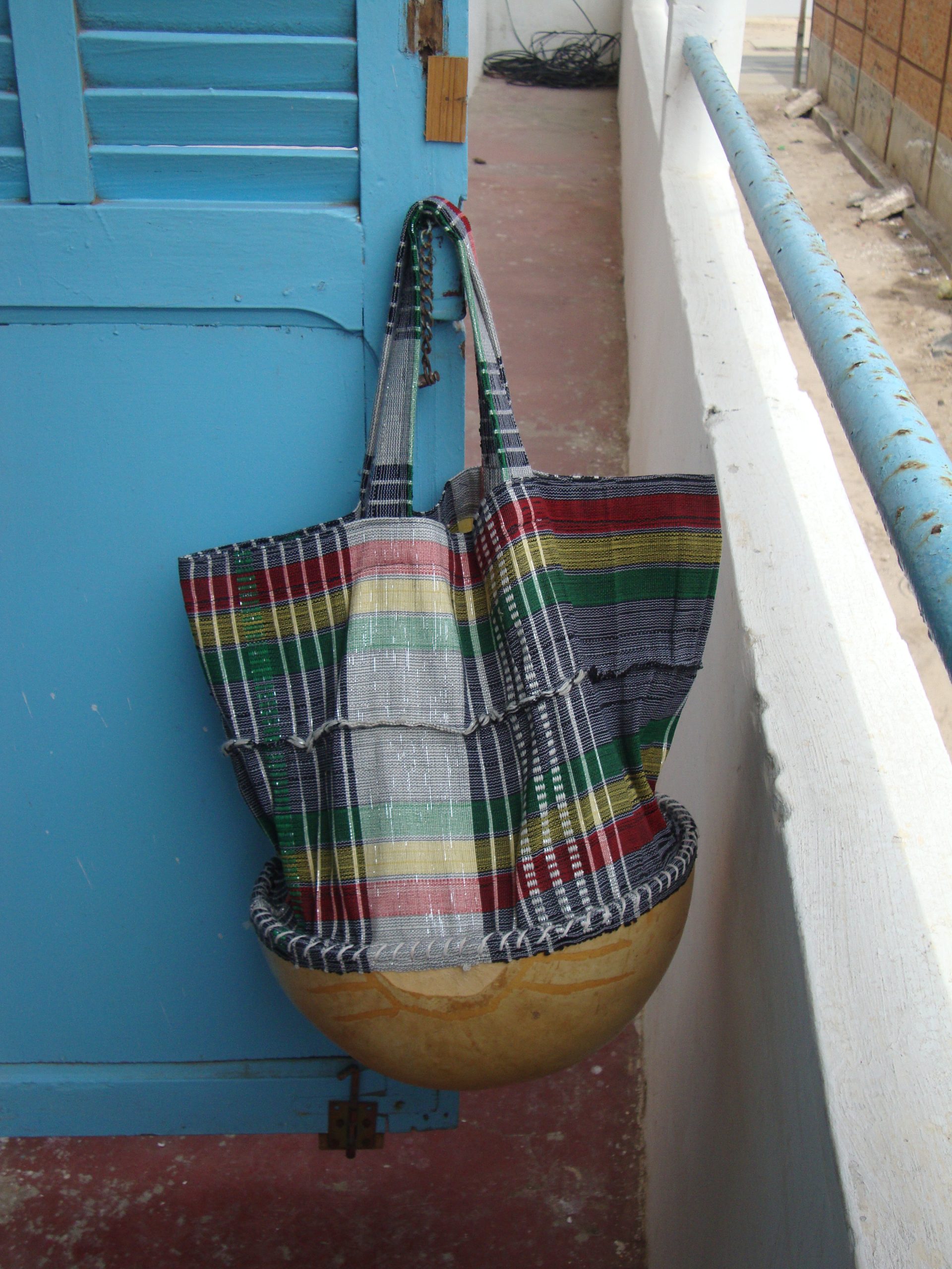After the market’s return episode with a calabash on my hip, fulfilled with fruits and vegetables, everybody smiling and sensitive to it, I tried to improve it. I closed the calabash, so things do not fall, and people do not see what I bring in. It can be used also to store fruits or bread on the kitchen counter. It is said in Senegal that the calabash is good for transport and store fruits and vegetables. It also can be appropriate to serve milk or water, as they do traditionally in the fields. The fabric was bought in the market and is traditionally used to wrap the children to the back of their mothers, as this they only sold it in a 10m range. I attached a photo of the lady who sold me the calabash and who sew the fabric to the calabash. The same way she did sew the broken calabash before. In the end, me and Madame shook hands as partners.