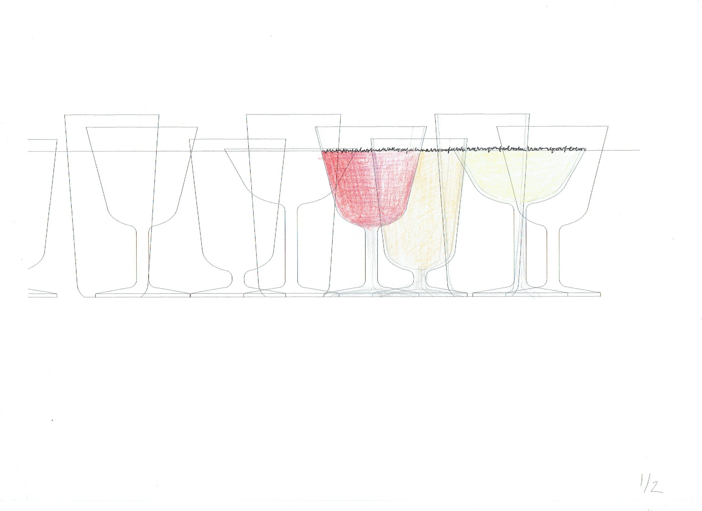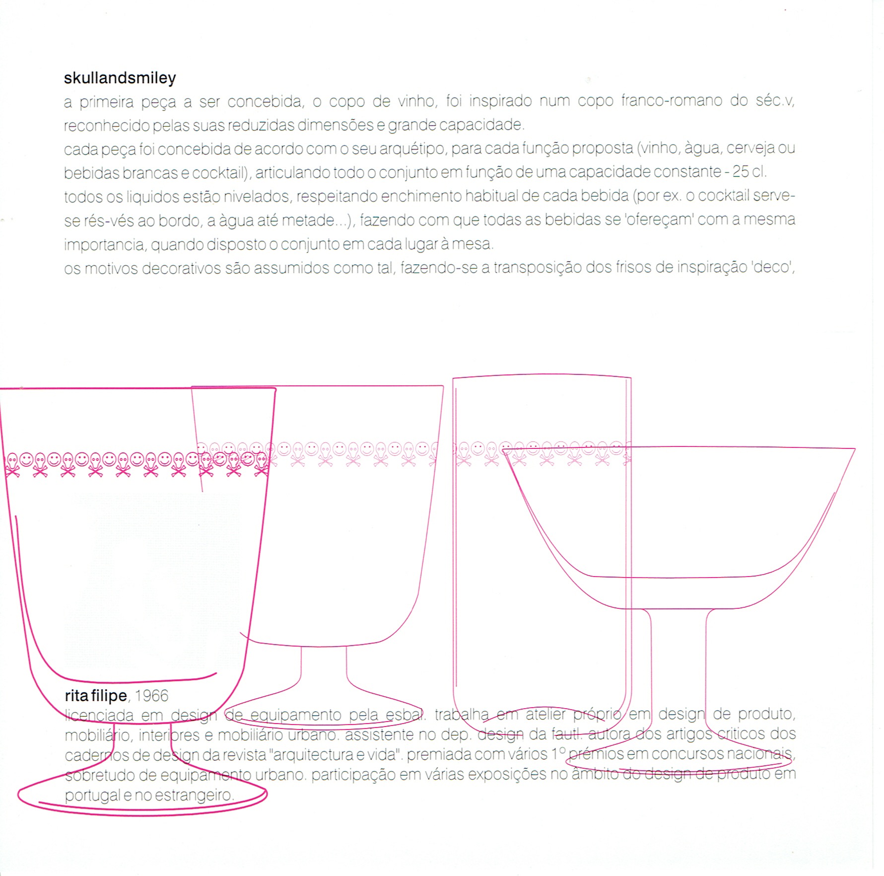 The first piece to be designed was the wine glass, inspired by a Franco-Roman séc.V glass, recognized by their small size and large capacity. Each piece is designed according to its archetype, for each proposed function (wine, water, beer or cocktail and white), leveling the whole in terms of a constant capacity of 25 cl - all liquids are at same level, while respecting the usual filling of each drink (eg. Cocktail serves to ground the board in water up to half ...), so that all beverage is "providing" with the same importance when the set disposed in each seat at the table. The decorative motifs are assumed as such, making up the implementation of the classic decorative friezes to 'pop culture'.